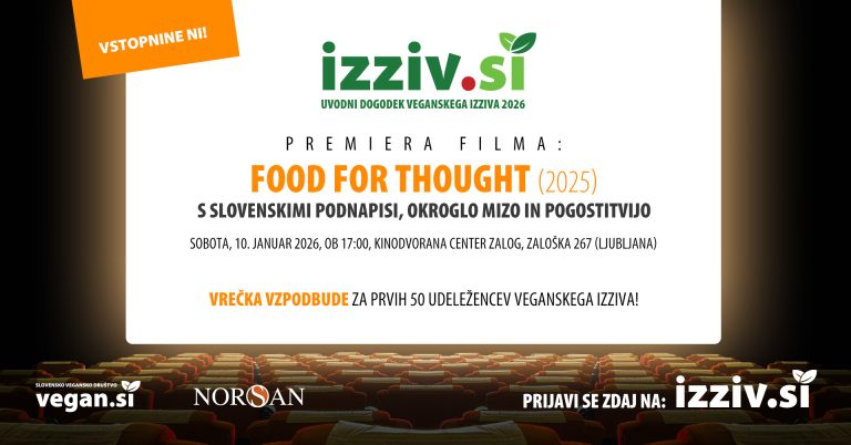 UVODNI DOGODEK VELIKEGA VEGANSKEGA IZZIVA 2026 Premiera filma: Food for Thought (2025) s slovenskimi podnapisi, okroglo mizo in pogostitvijo KDAJ: Sobota, 10. januar 2026, ob 17:00 KJE: Kinodvorana Center Zalog, Zaloška 267 (Ljubljana) Vstop je brezplačen tako za udeležence izziva kot tudi za vse ostale. Vstopnico za ogled filma